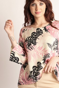 MÁS INFORMACION Realizado en Voile estampado floral. Escote redondo con collareta interna. De formato evasé con mangas 3/4 acampanadas. Largo a la cadera.