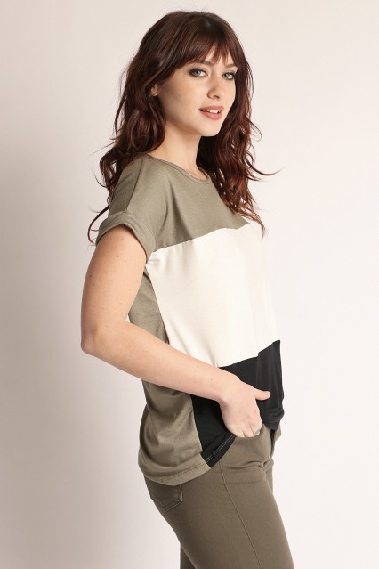 MÁS INFORMACION Realizado en Modal con Lycra . Formato cuadrado, tricolor. Espalda lisa mismo color de la parte superior de la prenda. Ruedo recto. Escote redondo con collareta aplicada. Dobladillo externo en manga.