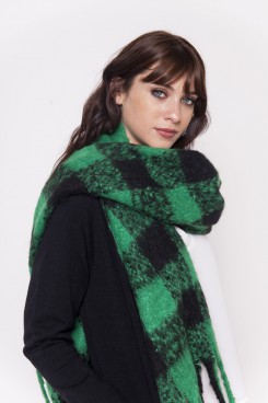 MÁS INFORMACION Realizado en Lana con acrilico . De formato rectangular de 2m de largo por 0.50m de ancho. Bitono a cuadros. Textura suave y cálida con flecos en terminaciones. Súper canchera para acompañar tus outfits esta temporada.