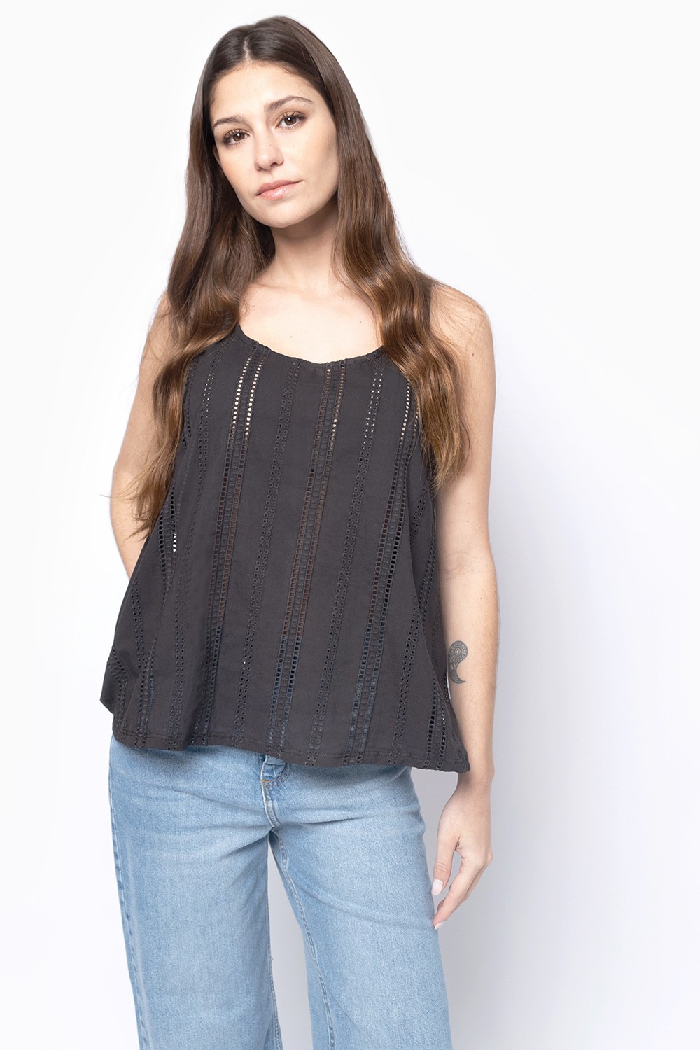 Blusa Mollet ART. 44212 Realizado en Broderie con motivo vertical que estilizará la figura. Escote redondo, sin mangas. Calce clásico. Largo a la cadera. Una prenda súper femenina y delicada que no te puede faltar en tu armario. DISPONIBLE EN: S - M - L - XL