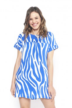 MÁS INFORMACION Realizado en Voile estampado animal print bitono en una saturada paleta de color. Manga corta con zócalo en igual tela, escote redondo. Canesú en delantero y espalda con cartera. Largo sobre la rodilla. Caja cuadrada, calce over suave que se adaptará con holgura a la silueta.