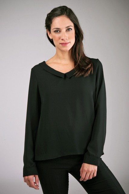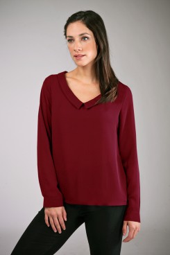 MÁS INFORMACION Realizado en Creppe liso. Escote v suave con cuello que le da un estilo femenino y delicado. Manga larga con puño y botón metálico. Largo a la cadera, formato holgado. Prenda con hermosa caída en una variada paleta de color.