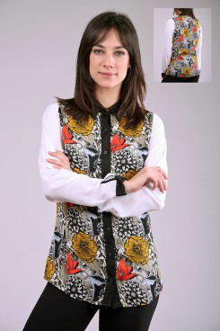 MÁS INFORMACION Realizado en Seda creppe estampada con motivo floral net combinada con liso dandole armonía y un toque personal al diseño. Hermosa paleta de color elegante y super femenina. Manga larga, botones de pasta al tono, largo a la cadera.