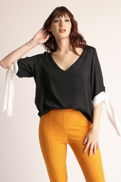 MÁS INFORMACION Realizado en Algodon Satinado . Formato sutilmente evasé. Manga 3/4 con puño y lazo a contra tono. Escote en V con vista interna. Espalda con lágrima y botón de pasta al tono. Largo a la cadera. su materialidad le aporta un sutil brillo a esta prenda de estilo romántico que no te podés perder.