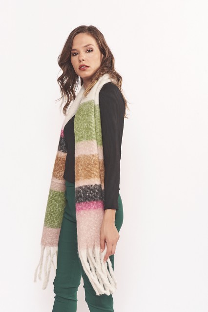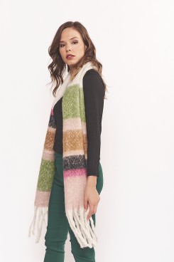 MÁS INFORMACION Realizado en Lana con acrilico . Motivo de rayas horizontales que le aporta un aire personal. Paleta de color variada, combinando colores saturados y suaves generando un hermoso resultado. Flecos en igual material. Formato rectangular. Medida: 1,86 x 0,39m.