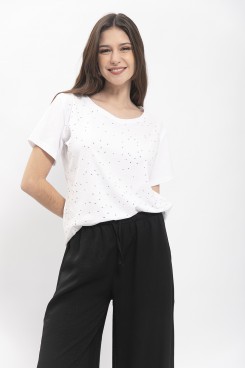 MÁS INFORMACION Realizado en Jersey liso, escote redondo, manga corta. Largo a la cadera. Calce clásico. Detalle de tachas termoadhesivas que lo son todo! súper canchera y versátil, levantrá con mucho estilo cualquier outfit!